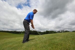 On an uphill lie, what should a right-handed golfer focus on during the swing?